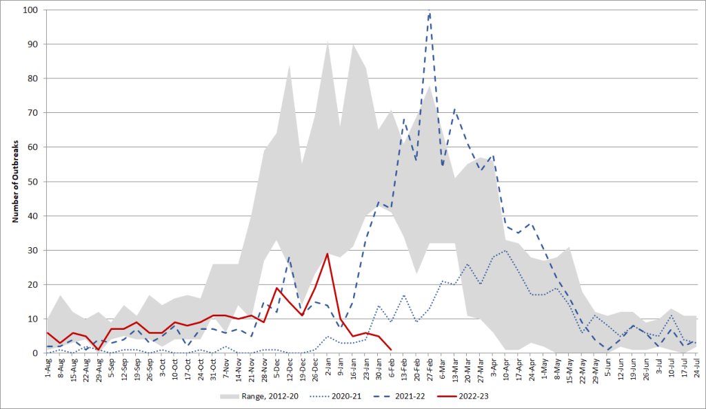 Norovirus outbreaks are not limited to the United States. Last April, the Public Health Agency of Canada posted a notice alerting Canadians to a nationwide Norovirus outbreak traced to contaminated oysters from British Columbia. Local infectious disease experts remarked that Norovirus is transmitted through feces, and the virus can survive for long periods in sewage systems. They share that outlets from sewers into water sources regularly test positive for Norovirus. Later, in December of 2022, the United States saw its own oyster-spread norovirus outbreak. The FDA reported that oysters harvested from Texas late last year caused illness throughout the south, in states including North Carolina. As countries continue to lift their travel restrictions, remote countries like the small pacific archipelago republic of Palau see an increase in infectious illness, including a February 2023 Norovirus outbreak. Most notably, government health agencies in England are reporting significantly increased trends in norovirus cases. In an update just last week, the U.K. Health Security Agency reported positive norovirus testing at rates “more than double the 5-season average prior to the coronavirus (COVID-19) pandemic.” Many cases are associated with nursing homes and assisted living facilities in people over 65. The dehydration and electrolyte imbalance associated with Norovirus impact elderly individuals and very young children more severely. Facilities where people cannot fully isolate when sick, such as nursing homes and college dormitories, are especially susceptible to infectious illness, and Norovirus is no exception. The chief executive of Care England, a British non-profit organization that assists seniors, shares with local news that underfunding facilities and short staffing may contribute to the current outbreak.