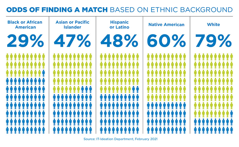 Fortunately, there are ways to narrow down our search for donors to just the most likely matches. Unfortunately, based on the pool of people who have registered, some ethnicities and races are less likely to find a donor through the registry. Be The Match, a non-profit organization that connects stem cell donors to recipients, discusses how ethnic background affects genetic compatibility. We inherit our HLA genes from our biological parents, who inherited them from our grandparents. This is why our siblings are our most promising genetic matches for stem cell donation. As of February 2021, the odds of finding a genetically compatible donor as a white patient were 79% compared to a Black or African American patient at only 29%. This significant disparity has increased marketing towards non-white racial and ethnic groups. The more diverse the donor registry becomes, the more likely it becomes for a patient from any ethnic background to find a match.